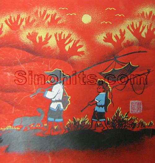 In this picture, a father and his son go fishing early in the morning with their hunting dog with them. Only the early birds catch the worms! Huxian County farmer's paintings feature a lot of working scenes.