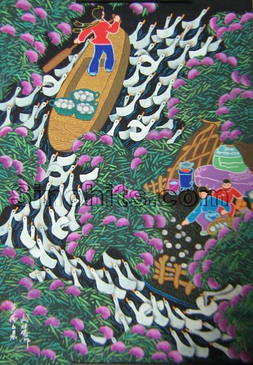 The young girl in red in this painting is collecting eggs laid by the ducks in the water.