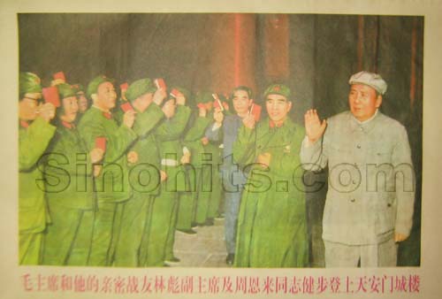 Chairman Mao and his intimate comrade-in-arms Vice Chairman Lin Biao together with comrade Zhou Enlai walk with vigorous strides to the Tian'anmen Gate Tower