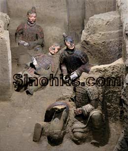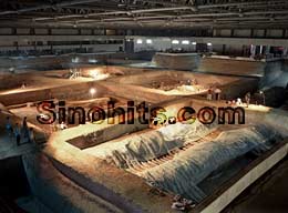 The excavation, which is considered China¡¯s greatest archeological find in the 20th century, was made when a group of peasants were digging a well, and found fragments of terra cotta in March 1974. This site was named Pit One, and the later two sites excavated were respectively named Pit Two and Pit Three.